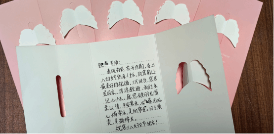 在温馨感人的氛围中,教师代表李建军教授为现场女教职工们送上了一份份特别的礼物——由学生们亲手书写、精心设计制作的节日贺卡。其中有张贺卡这样写道:“三尺讲台,您尽显风采。谆谆教诲,我们永记心怀。”收到这份充满心意与温度的特别礼物,老师们脸上洋溢着欣慰与感动的笑容。